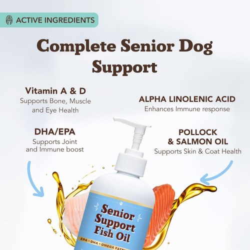 - OMEGA 3 + TURMERIC SYNERGY: This liquid supplement for senior dogs combines EPA and DHA from wild-caught fish oil, plant-based omegas from borage oil to support skin hydration and joint comfort, and antioxidant-rich turmeric to promote cognitive function, heart health, immune strength, and mobility. With added vitamin D, it helps maintain strong bones and overall well-being in every pump.