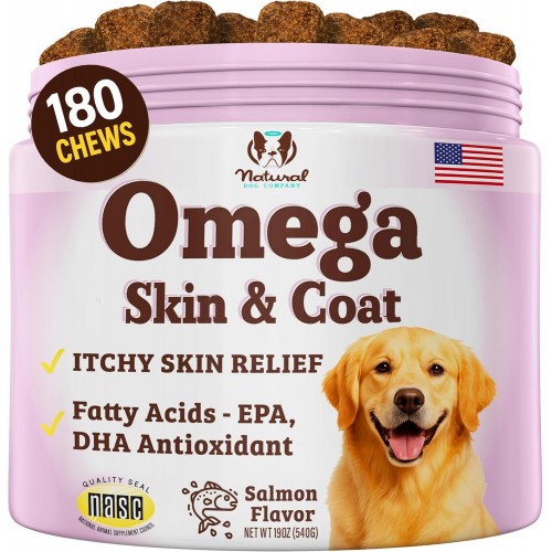 Natural Dog Company Omega Chews for Dogs Skin and Coat Support with Salmon Oil and Fatty Acids, Helps Itchy Skin, Dryness, Shedding, Supports Joints, Heart,Immune System & Overall Health (180 cnt)